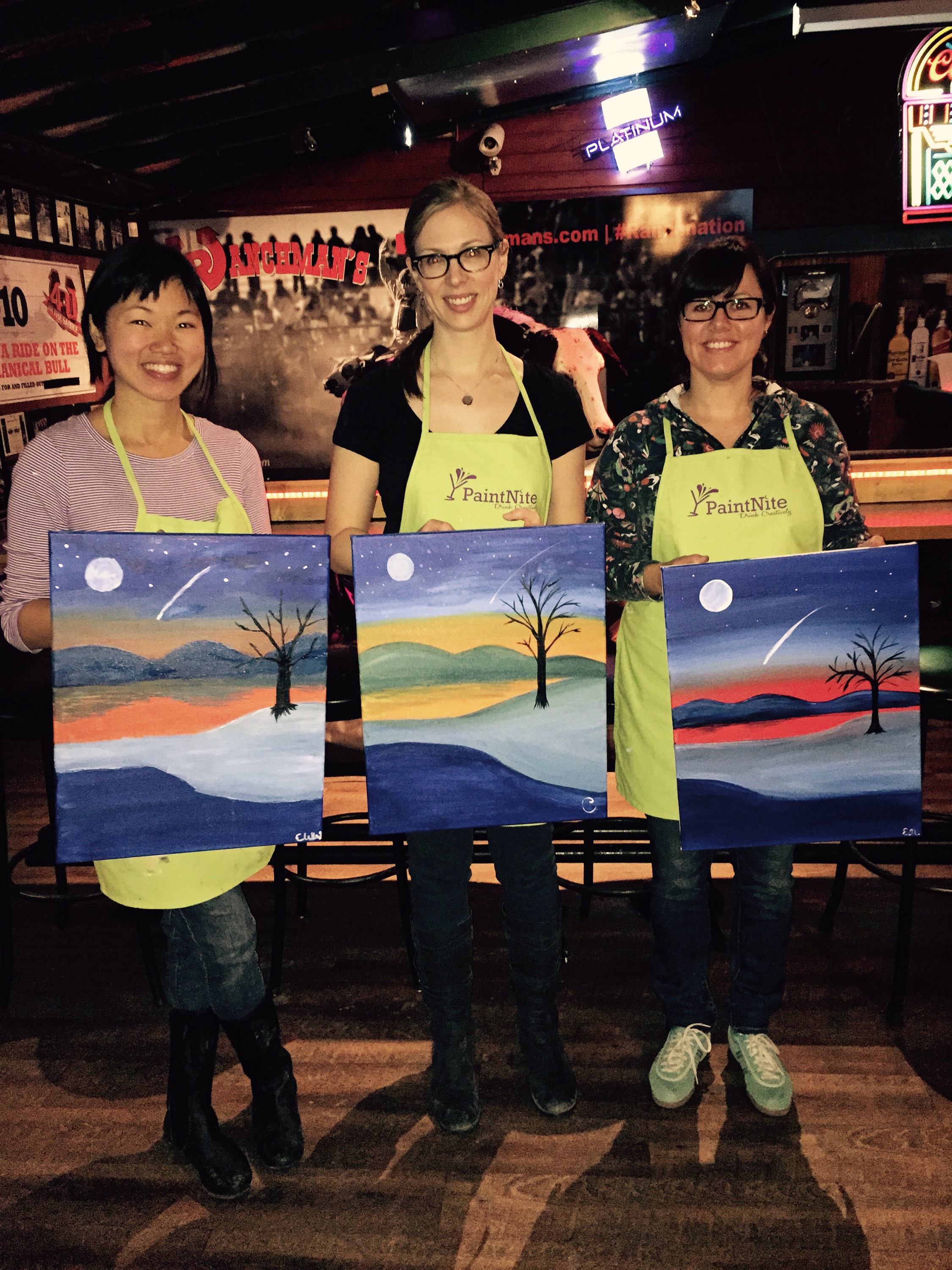 Recently a couple of friends and I decided that we don’t see each other enough and wanted to change that by trying a Paint Nite. The concept of Paint Nite is going out with friends to try your best at painting a picture while enjoying a few beverages. Different bars across the city host the events which range from very easy to very difficult. For our first attempt we decided to try “very easy” hosted at the country bar Ranchman’s.